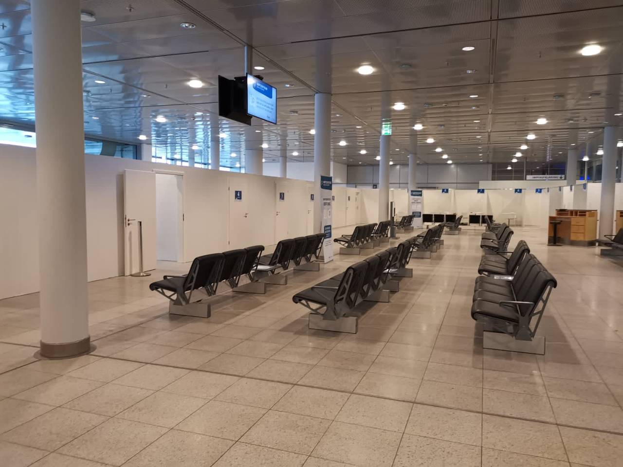 "Eingang Impfbereich" statt Wartebereich für Abflug und Landung - Das Impfzentrum am Flughafen Münster Osnabrück in Greven ist betriebsbereit. Sobald der Impfstoff in Deutschland zugelassen ist, werden hier in 7 Impfstraßen jeweils bis zu 240 Menschen, in 12-Stundenschichten am Tag, geimpft. Dafür stehen ein Raum für die Registrierung, Impf-Kabinen und ein Warteraum für einen Beobachtungszeitraum bereit. Momentan rechnet der Kreis damit, dass ab Januar der Betrieb los geht, für Risikopatienten. Landrat Martin Sommer stimmt das optimistisch, mit dem großen Durchbruch rechnet er erst später.