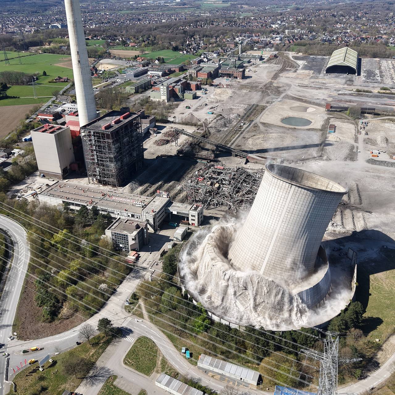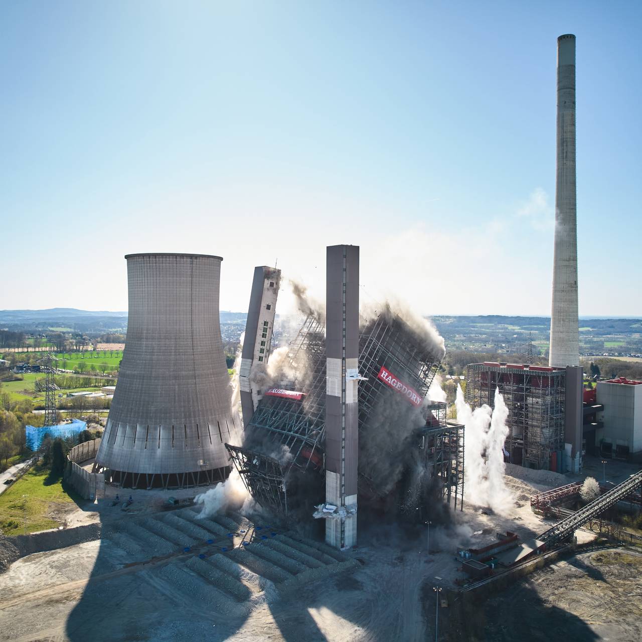 Das Kesselhaus und der Kühlturm des ehemaligen Steinkohlekraftwerks in Ibbenbüren gingen am Sonntag (6. April) erfolgreich zu Fall. Die Hagedorn Unternehmensgruppe und die Amprion GmbH markieren damit einen bedeutenden Schritt in der nachhaltigen Nutzung des Standorts.