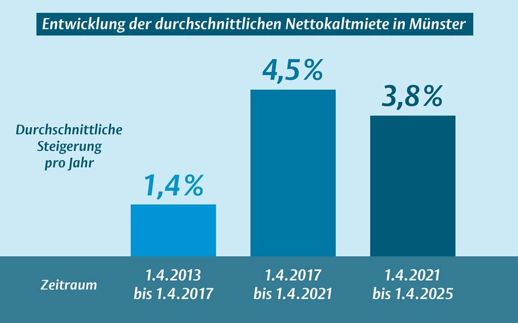 Münster veröffentlicht neuen Mietspiegel: Die ortsübliche Vergleichsmiete steigt auf 9,85 Euro pro Quadratmeter. Die jährliche Steigerung verlangsamt sich leicht.