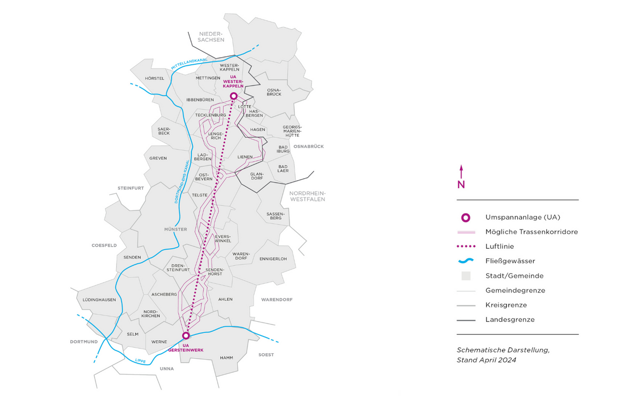 Woher die Route der Stromtrasse genau verläuft, entscheidet sich erst später. Im Herbst schlägt Amprion der Bezirksregierung Münster eine favorisierte Route vor; 2026 die genauen Standorte der Strommasten. Der Baustart ist 2028 geplant.